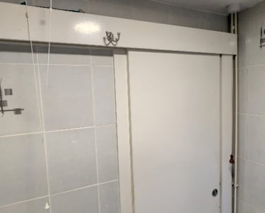 Sliding door old replaced for new. Door hanging on a slick door slider.